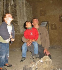 Worauf die Drei in der Einstimmungshöhle so gebannt blicken? Durch ein Loch sehen sie, was sich oben, über dem Erdreich, gerade abspielt.